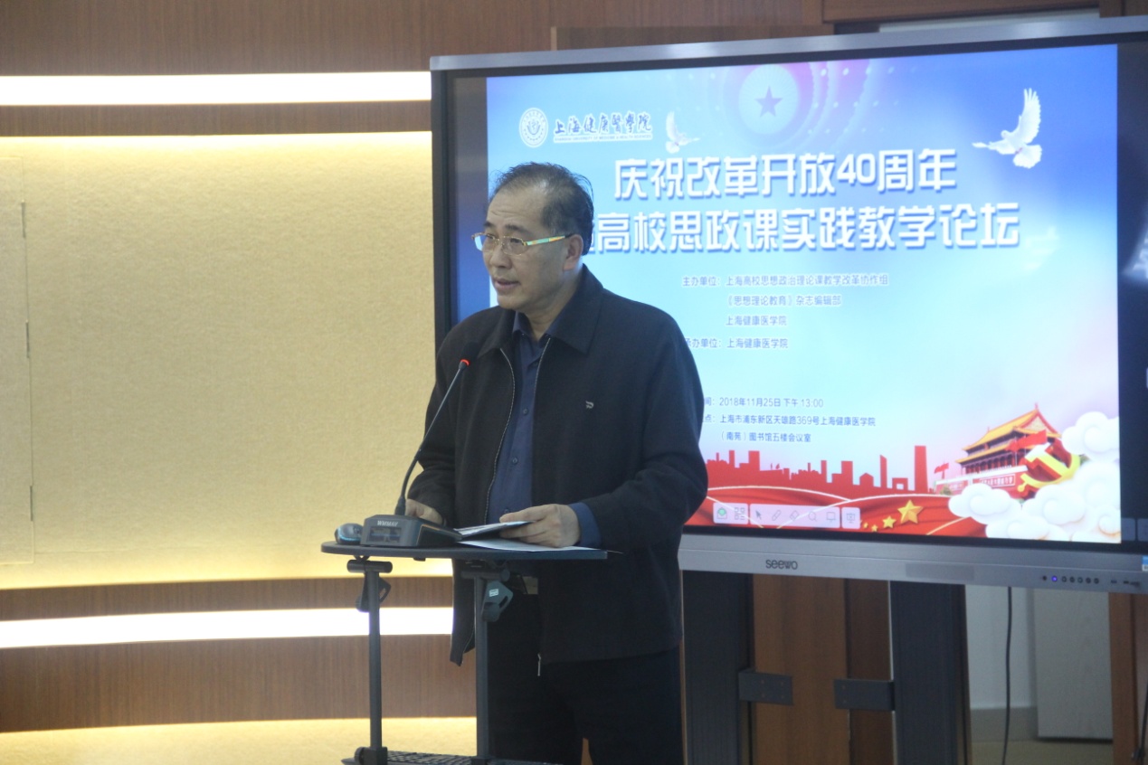为了庆祝改革开放40周年,进一步贯彻落实教育部《新时代高校思想政治理论课教学工作基本要求》,由上海高校思想政治理论课教学改革协作组、《思想理论教育》杂志编辑部和上海健康医学院联合主办并由上海健康医学院承办的“庆祝改革开放40周年暨高校思政课实践教学论坛”于 11月25日在校南苑图书馆五楼会议室召开。上海健康医学院党委书记郑沈芳、副校长唐红梅、上海高校思想政治课教学改革协作组组长忻平、宣传部部长李兆伟、马克思主义学院党政班子及全体教师出席了论坛。论坛还特邀相关领域的专家,他们分别是:陈云纪念馆馆长、书记陈麟辉、上海交通大学陈锡喜教授、华东师范大学宋进教授、复旦大学高国希教授、上海大学王天恩教授、上海海洋大学董玉来教授、上海电机学院何小刚教授、南通大学顾玉平教授、合肥师范学院吕明教授、华东理工大学徐国民教授、上海理工大学胡绪明教授、上海市阳光康复中心副院长王成和《学术界》编辑部主任汪家耀。论坛由马克思主义学院副院长曹月柱主持。