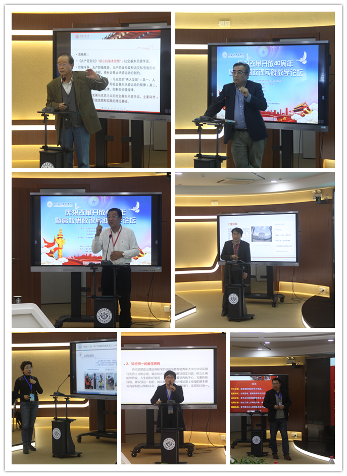 陈锡喜教授、宋进教授和副校长唐红梅分别做了主旨发言。陈锡喜教授围绕“邓小平改革开放思想和实践的理论基础”这一主题,深入阐释了邓小平关于社会的基本矛盾问题,他在鲜明区分“基础理论”和“理论基础”范畴的基础上,从不同的维度进行了解读。从理论维度上为邓小平作马克思主义理论辩护,指出邓小平理论并非实用主义,而是同马克思主义一脉相承的;从历史维度,以改革开放作历史辩护,回归马克思主义的核心思想;从现实维度,为主要矛盾的转化作深入解读;从未来维度,为发展21世纪马克思主义确定“硬核”。以社会基本矛盾学说为理论依据,根据我国社会各种矛盾的发展变化,即时把握主要矛盾的转化,从而推进改革的全面深化。宋进教授则重点强调,在思政课教学改革和发展过程中要有问题意识。他结合习近平总书记治国理政方面的精神,突出强调我们应重视内涵其中的中国乃至世界“从哪里来到哪里去”的问题意识,这是中国改革开放40周年的实践总结,也是时代赋予中国共产党新的时代课题,这直接关系到中华民族的前途和命运,所以,我们在思政课教学中一定要把问题意识融入其中。唐红梅副校长则围绕“以德立学 探索课程思政育人机制”展开,她指出,为了深入贯彻新时代全国高等本科教育大会精神,学校明确将“立德树人”作为工作的检验标准,建立了学校课程思政评价的指标,具体分为4个一级指标、14个二级指标和30个具体达标观测点。并且从五个方面具体展开:“培养目标与方案”融入育人主旋律;“教师队伍”建设提高育人执行力;多方联动筑牢“课程育人”主要阵地;学生为本观测“德育效果”;教学比武促“评价指标”精准落地。通过这些措施的实施,最终实现了把社会主义核心价值观内化于大学生的心中,外化于他们的实际行动中。