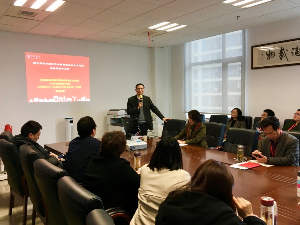 胡涵锦,上海交通大学马克思主义学院教授、博士生导师、上海市高校思想政治理论课教学指导委员会副主任委员、《东方讲坛》特邀讲师。胡教授从自己作为一名已从事36年高校思政课教育教学的教师经历谈起,首先谈学习习近平总书记在学校思想政治理论课教师座谈会讲话精神的体会,强调思政课教师一定要认真学习习近平总书记的重要讲话,要有问题意识,不断更新教学理念。既要认识到思政课教师责任重大,又要有信心有能力把思政课教好,不断提高思政课教师的看家本领。随后,胡教授结合2018版新教材的使用,启发大家要认真思考两个问题:一是新教材有哪些值得深入思考和研讨的问题;二是为什么认为这些问题可以成为问题,并结合教学实践谈了自己的思考。最后,胡教授和教师们就教学过程中难点、热点问题进行了互动和交流,鼓励老师们要喜爱思政课教师这份职业,对学生不仅要讲好中国故事,也要讲好道理,传播好新思想。