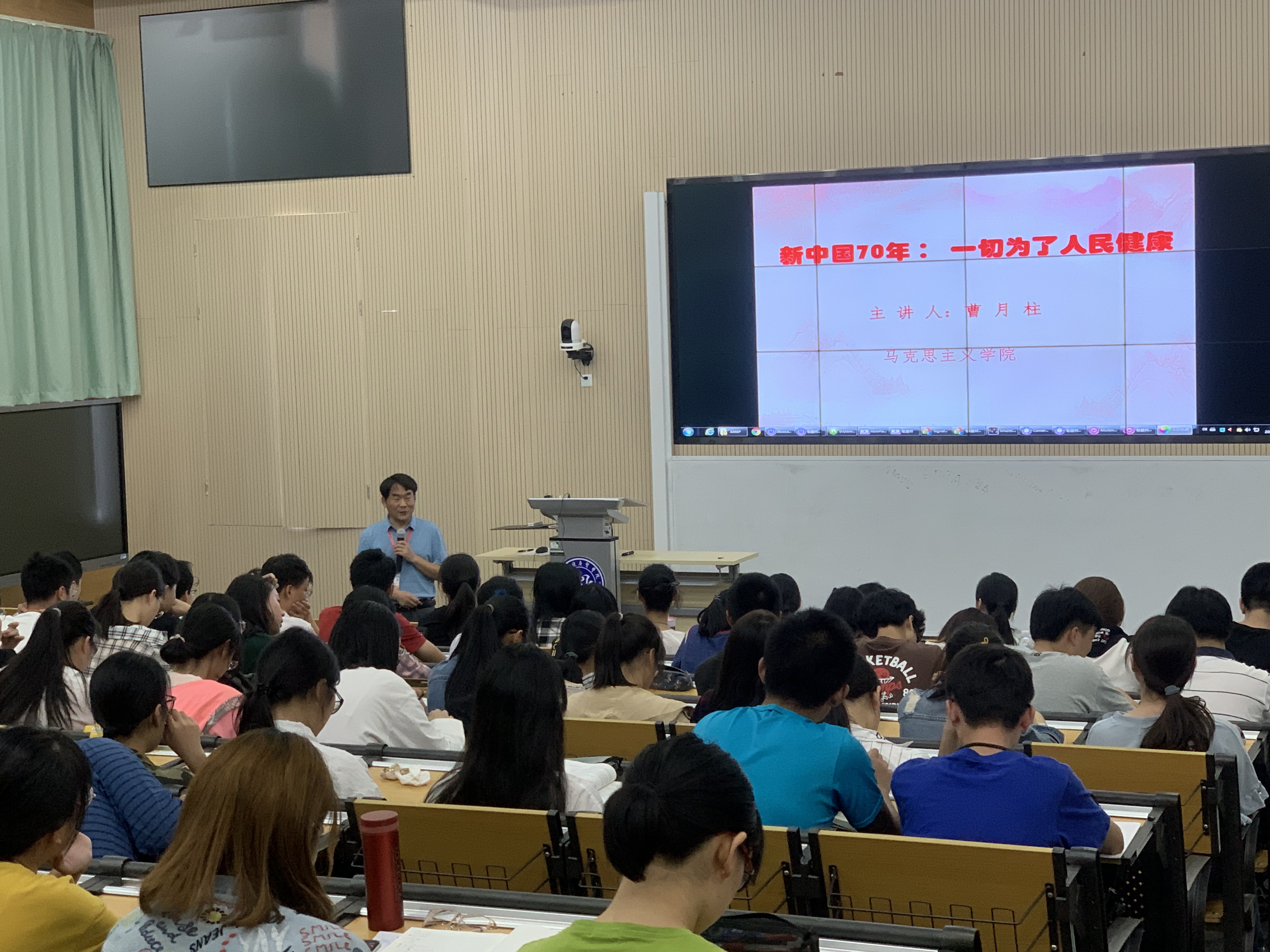 9月26日下午,在南苑w100沉浸式教室,马克思主义学院曹月柱老师为19临床医学专业学生主讲了“新中国70年:一切为了人民健康”的专题教学。