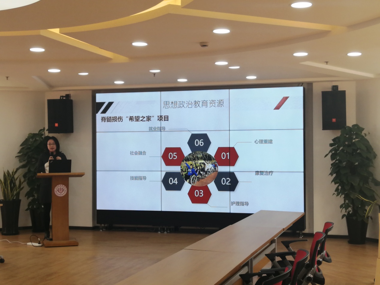 2018年6月,马克思主义学院与上海市阳光康复中心签约共建大学生思想政治教育实践基地。一年多来,双方在思想政治理论课教学、志愿服务、实习见习中的思政教育等方面开展了深度合作,使“阳光.思政”成为双方共建的思想政治教育品牌。胡佳科长对照学校课程思政示范基地的标准从三个方面对实践基地的建设进行了汇报,全面展示了双方在思政课程、课程思政、志愿服务及见实习思政方面所做的探索。曹月柱副院长对基地建设的整体设计及下一步双方开展的合作进行了介绍。11月21日,上海阳光康复中心的生命教育宣讲团将走进人民健康课堂开展“让阳光洒满心田、让奋斗成为青春最鲜亮底色”的主题宣讲。