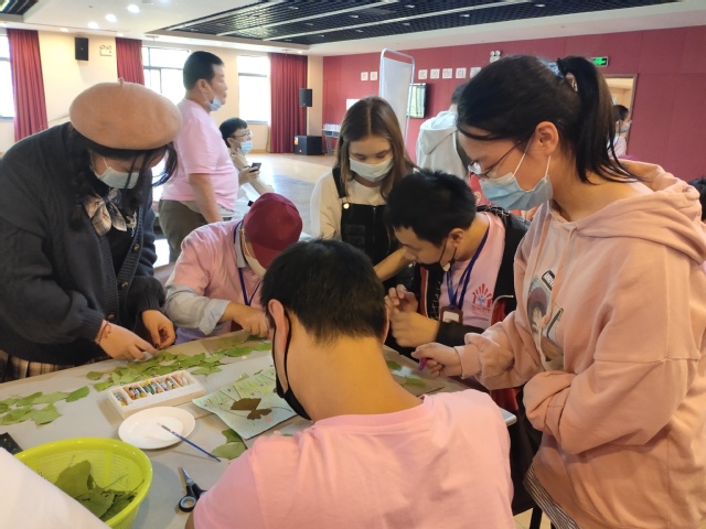 此次志愿者服务围绕阳光之家训练营开展,志愿者被分为2组,分别为来自浦东新区和杨浦区的智障人士提供服务。第一组志愿者在训练营的手工服务室,一对一协助学员进行树叶艺术画创作和乒乓球练习。第二组志愿者在手语学习班,以小组为单位,与学员共同学习歌曲《我和我的祖国》手语表达,并为学员纠正手语姿势。