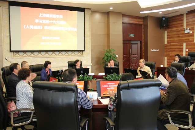 2017年10月27日,上海健康医学院马克思主义学院召开了“学习党的十九大精神暨《人民健康》思政选修课集体备课会”,上海健康医学院党委书记郑沈芳教授、校长黄钢教授、副校长唐红梅教授、上海交通大学特聘教授、中央马工程首席专家陈锡喜教授、复旦大学高国希教授、上海市德育中心副主任宗爱东教授和兄弟院校上海海洋大学、上海电力学院马院相关负责人、《人民健康》课程主讲嘉宾、学校相关职能部门负责人以及马克思主义学院全体教师出席了会议。