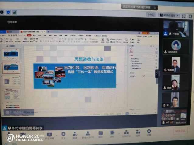 在开会之前,各位老师重新学习了课程教学大纲和实践教学大纲,对标中宣部、教育部颁布的《新时代学校思想政治理论课改革创新实施方案》,提出了教学大纲的修订意见。大家普遍认为,在2020版新教材使用后,有必要对教材每一章的教学重点和难点进行重新修订,以适应新的教学内容。与新教材匹配的实践教学大纲,应着力突出我校特色,以“医患共情”为主题,构建医路引领、医路修德、医路前行“三位一体”实践教学体系。在经过充分讨论之后,教研室主任付卓婧老师,根据学校专家指导意见,整合了说课程PPT,从课程目标、教学内容、教学改革设计、教学评价、教学资源五个方面向全体教师进行了汇报,并听取了大家的意见与建议。