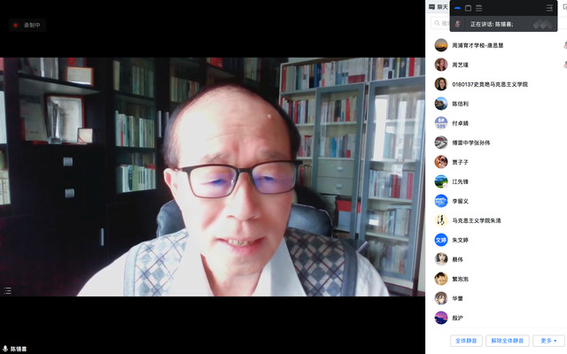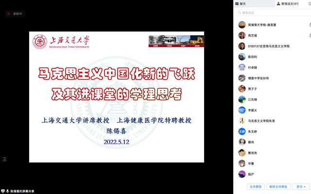 为了更好地贯彻和落实习近平总书记在中国人民大学考察调研时重要讲话精神, 把思政课的“道理”讲深、讲透和讲活,马克思主义学院“双名助推”教师素养提升计划之“名师导教”第十三期云端开讲。邀请上海健康医学院特聘教授、上海交通大学讲席教授陈锡喜作题为“马克思主义中国化新的飞跃及其进课堂的学理思考”的专题讲座。我校全体思政课教师和部分辅导员、协作共建单位海南省卫生健康职业学院马克思主义学院全体教师、我校思政课大中小一体化建设共建单位浦东新区周浦学区政治教师参加了此次讲座。讲座由马克思主义学院院长孙玉良教授主持。