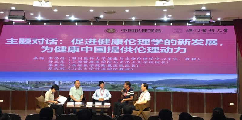 在由温州医科大学教授刘婵娟主持的主题对话环节,温州医科大学教授李恩昌、上海健康医学院马克思主义学院院长孙玉良、西安医学院附属医院院长李亚军、山东大学外语学院教授苏永刚围绕“促进健康伦理学的新发展、为健康中国提供伦理动力”的主题,展开了对健康伦理学兴起背景、学科发展与建设的探讨。