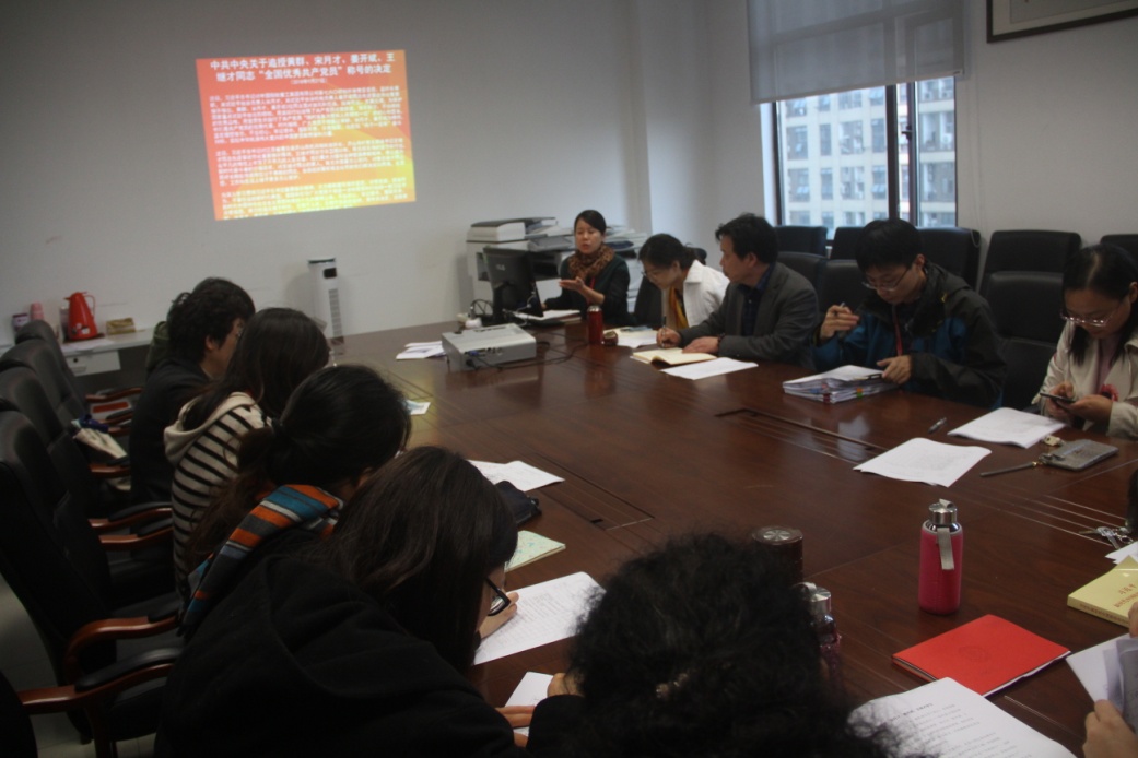 直属党支部书记朱清书记做总结发言。黄群等四位同志信仰坚定,对党忠诚,甘于奉献,勇于牺牲,体现了共产党人的崇高品格。我们应见贤思齐,将学习时代楷模精神与学习全国教育大会精神相结合,牢固树立“四个意识”,坚定“四个自信”,在新时代立足岗位,牢记“立德树人”使命,不辜负党和人民的期望。(付卓婧)