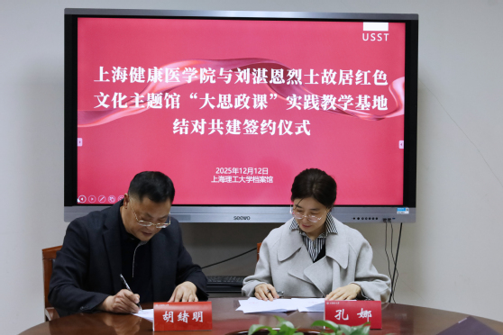 12月12日下午,上海健康医学院马克思主义学院与刘湛恩烈士故居红色文化主题馆“大思政课”实践教学基地结对共建签约仪式在上海理工大学档案馆会议室顺利举行。上海健康医学院马克思主义学院院长胡绪明,党委宣传部副部长、马克思主义学院副院长曹月柱,上海理工大学党委宣传部副部长李凡,档案馆馆长孔娜等相关人员出席仪式。仪式由孔娜主持。