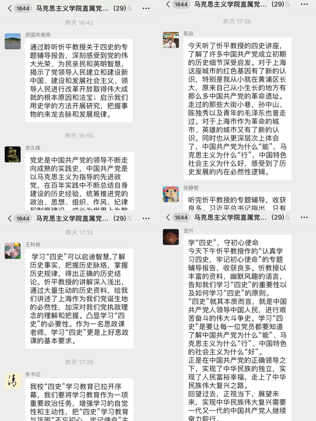 听完报告后,党员们围绕如何将“四史”学习教育融入立德树人中等展开讨论。张静君老师表示,听完忻平教授的专题辅导,收获良多,习近平总书记指出,只有坚持思想建党、理论强党,不忘初心才能更加自觉,担当使命才能更加坚定,要把学习贯彻党的创新理论作为思想武装的重中之重,并同学习党史、新中国史、改革开放史、社会主义发展史结合起来,作为一名马院的教师,我们更要学好四史,才能讲好思政课。李留义老师表示,忻平教授在“四史”讲座中,围绕中国共产党的创立和发展,以宏观的架构和细腻的视角,把党的革命历程与丰功伟绩结合起来,把理论阐释与历史叙事有机统一,娓娓道来,深入浅出,动之以情、晓之以理,让我们深刻感受革命成果的来之不易,以及革命先烈的英勇与伟大,深知作为一名新时代的高校工作者,应继承和发扬中国共产党的优秀革命传统,用实际行动践行肩上的那份使命与担当。王亚娟老师认为,忻教授的讲座内容丰富,深入浅出地阐释了当下开展“四史”学习教育的必要性和学习“四史”的重大意义,作为一名思政教师要知史学史,以史明志,将学习“四史”与教育教学改革密切结合起来,真正做到学深悟透、学以致用。江先峰老师表示,“四史”教育是新时代党着眼于中华民族伟大复兴大业,筑牢广大党员信仰的伟大创举,今天通过学习忻教授的报告,认识了学习的意义、主要内容、内在逻辑,后面我要将所学所得所悟融入教学之中,助力大学生“四个自信”培育。最后直属党支部书记朱清分享了自己对“四史”学习教育的认识,她表示,要把“四史”学习教育与巩固“不忘初心、牢记使命”主题教育成果结合,与推进当前中心工作结合,与加强党支部建设结合,推动学习教育取得实效。