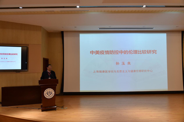 在主旨发言阶段,上海健康医学院马克思主义学院院长孙玉良教授围绕“中美疫情防控中的伦理比较研究”的主题,从伦理的视角展开了深入地分析和阐释。他主要从问题的缘起、疫情防控蕴含的基本伦理问题、中美两国的不同选择以及不同的伦理原则等方面,运用马克思主义的相关原理和方法,用详实的数据,跨学科、多维度地展现了中美抗击疫情的鲜明反差,深入浅出、层层递进,让我们更深刻体会到我国伟大抗疫精神的可贵,同时也让我们认清了美国所谓“人权”的虚伪。